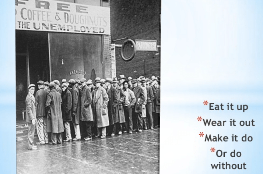 That my grandparents would have embraced this maxim makes sense as it does that my mother and uncle, their children, would have. My grandfather was raised in poverty, one of 8 or 9 surviving children of Irish immigrants to Boston, and a WWI veteran. His wife, also a child of Irish immigrants, struggled after her father died leaving her mother to care for 8 or 9 young children alone. My grandparents raised their children during the Great Depression. My father also grew up during the Great Depression and was a WWII veteran. His father died in 1939, leaving his wife and three children to struggle in desperate enough poverty that my father told stories of leaving apartments in the night because they could not pay the rent, and of searching for food. All the members of my family were adults during WWII.